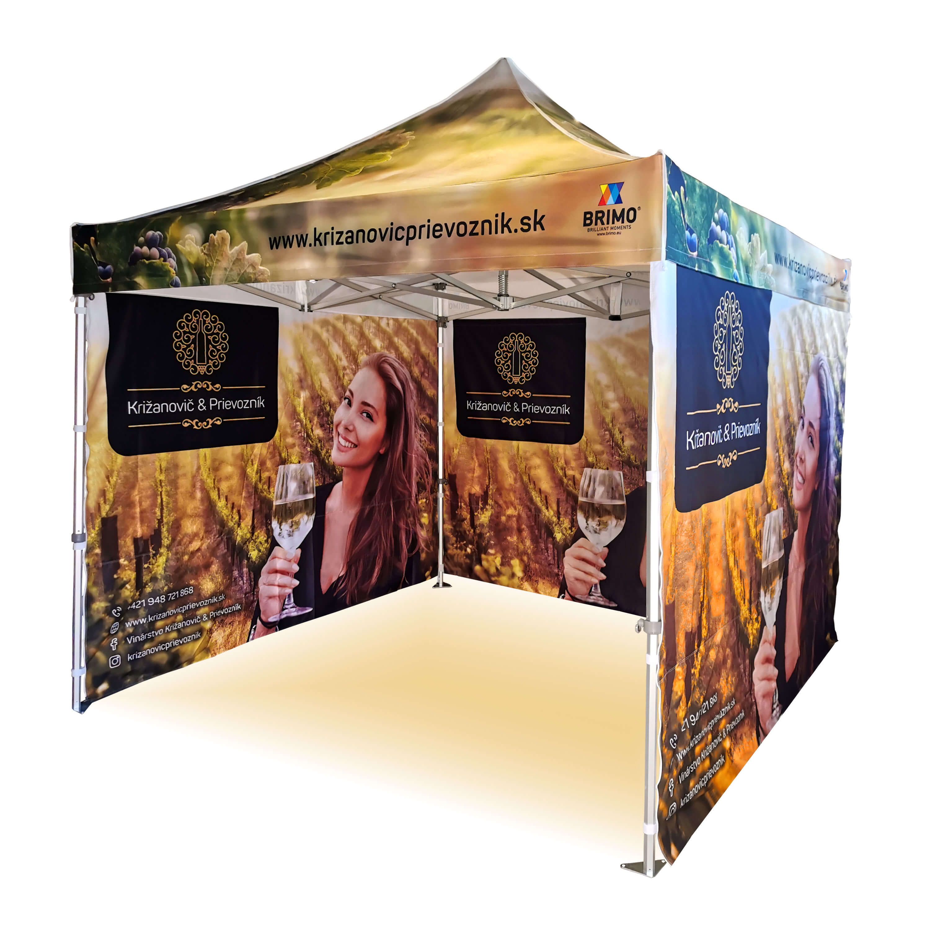 Werbezelt mit digitalem Sublimationsdruck. Der Druck entsteht durch einen chemischen Prozess, bei dem die Tinte unter hoher Temperatur direkt in die Struktur des Stoffes eindringt. Logo, Schriftzug oder jede Art von Grafik auf der Innen- oder Außenseite des Zeltes nach Kundenwunsch.